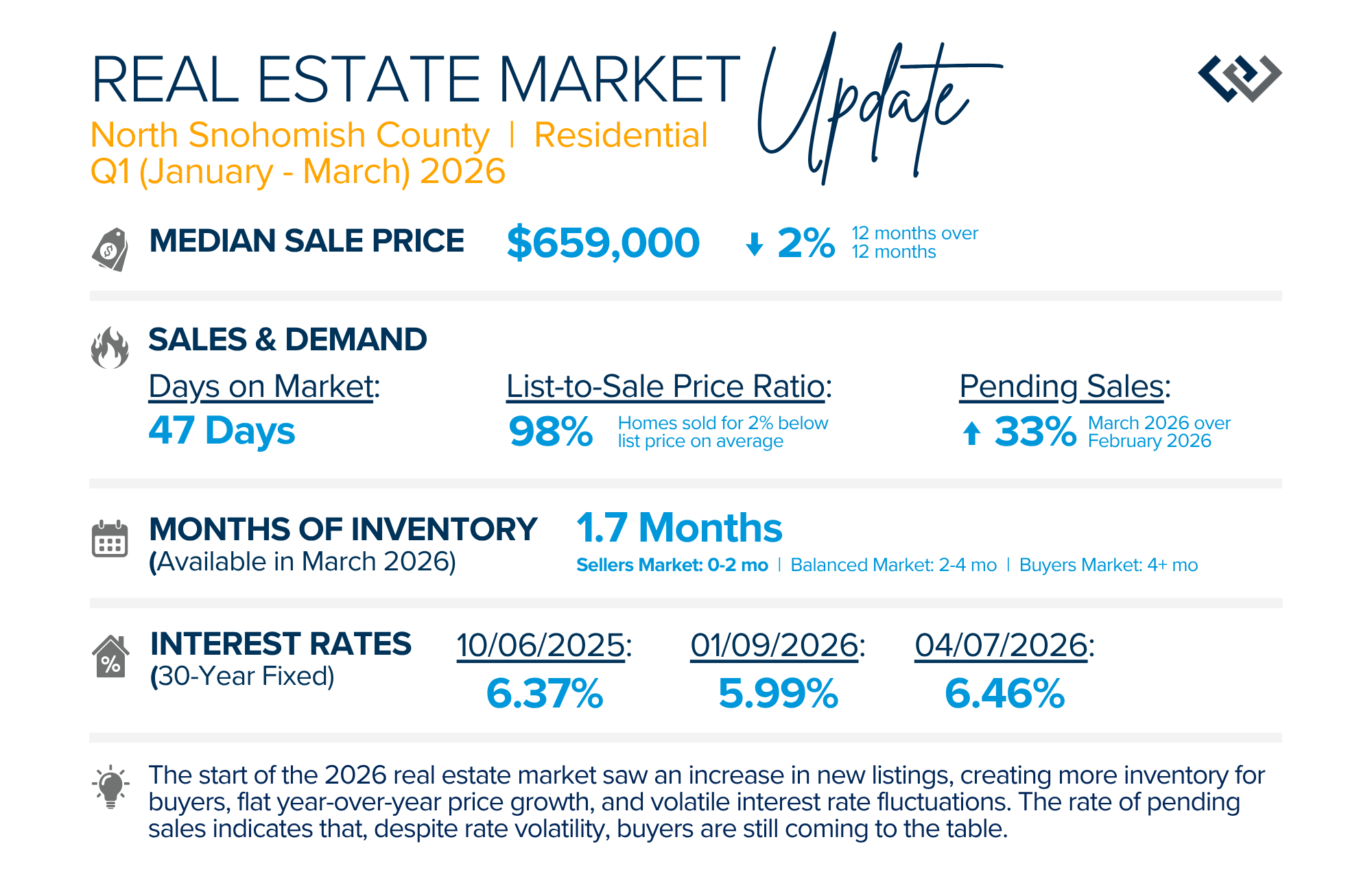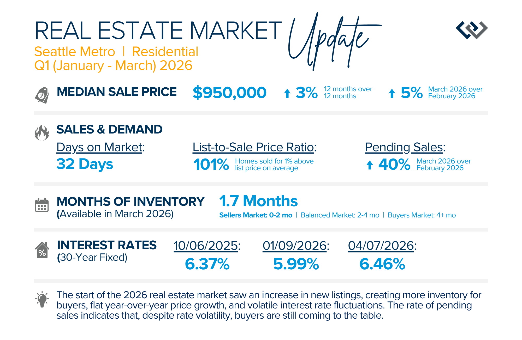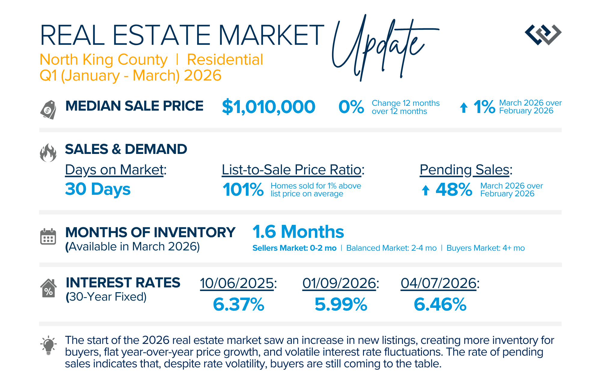 The start of the 2026 real estate market saw an increase in new listings, creating more inventory for buyers, flat year-over-year price growth, and volatile interest rate fluctuations. As we finished Q1, prices began their seasonal uptick month-over-month, with pending sales also starting to rise. With more selection, the market is favoring well-prepared homes that are priced accurately.